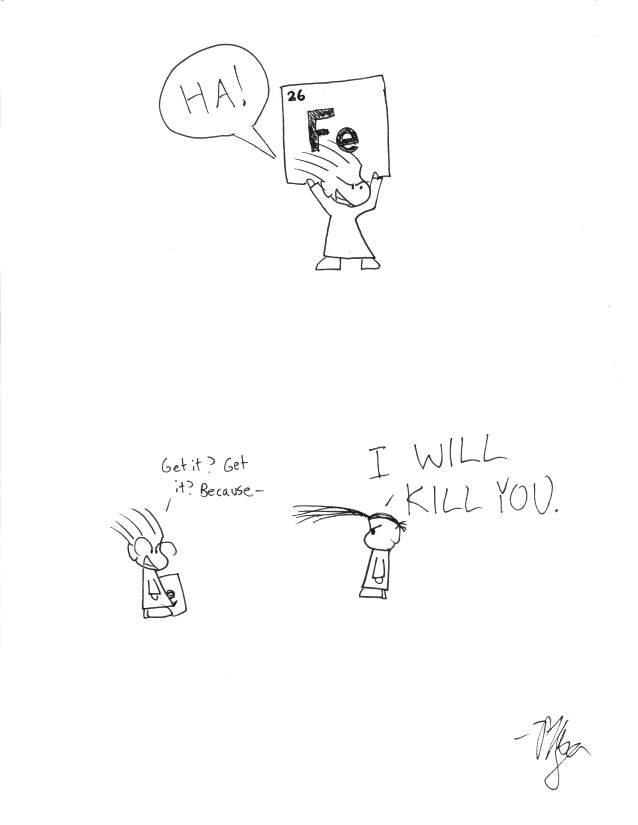 So here we have the last of the three HA! comics (for lack of a better term). This one's not even a pun, it's that stupid. If you don't get it, ask a friend who knows chemistry. Or go learn element symbols, it's not that hard, you ought to know, sheesh.