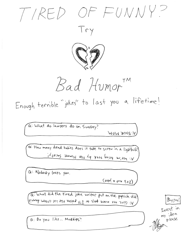 Ok, so my handwriting is a bit messy sometimes so I suppose it's possible you might not be able to read some of these. So, if you really need it, here are the text transcripts of the jokes written on the deformed, short, stumpy popsicle sticks in the comic: